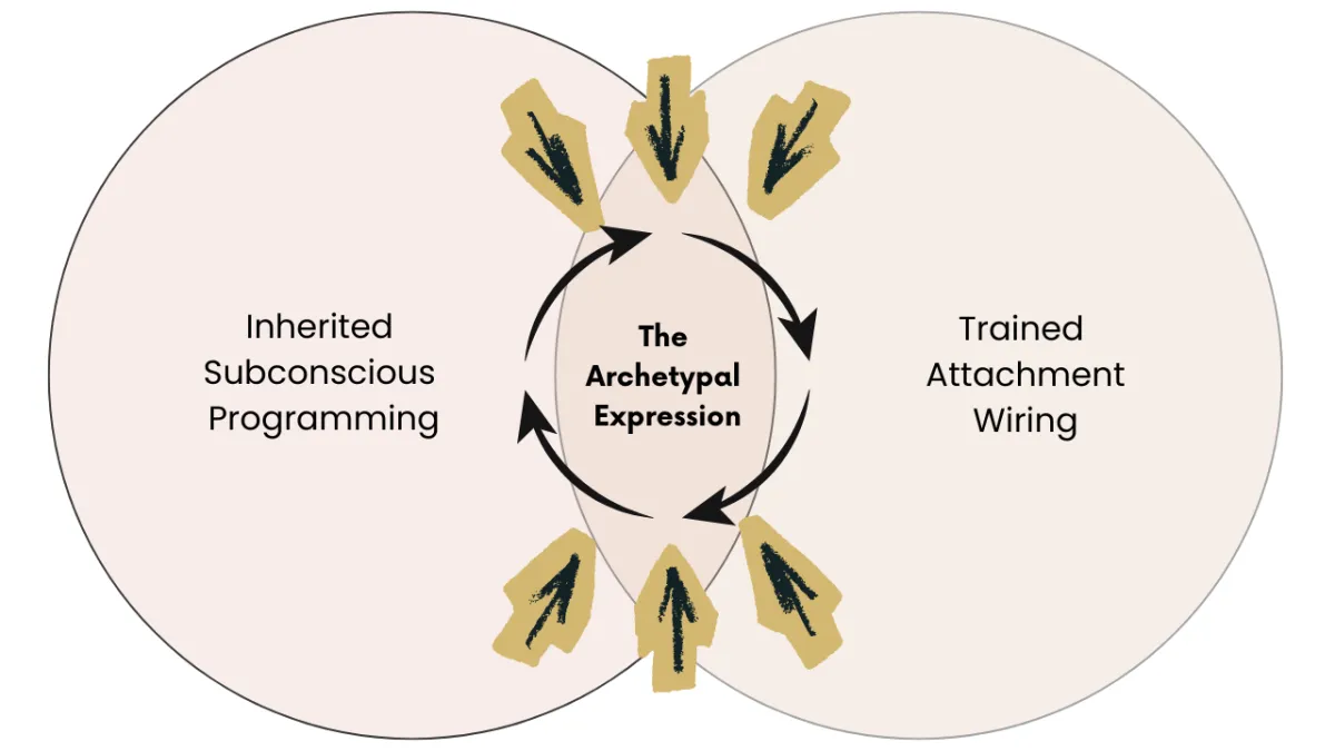 Here's why this matters — your subconscious mind is responsible for up to 90% of your behavior. And this inherited programming got there first. Everything your conscious mind has learned since has just been built on top of it — trying to confirm and make sense of what was already running the show underneath. This programming expresses itself through what I call the Witch's Wound in the feminine (No, it has nothing to do with actually being a witch) — and the Warrior's Wound in the masculine. These wounds show up through one of six specific archetypes — and those archetypes give us the exact blueprint for what the subconscious mind was programmed with.