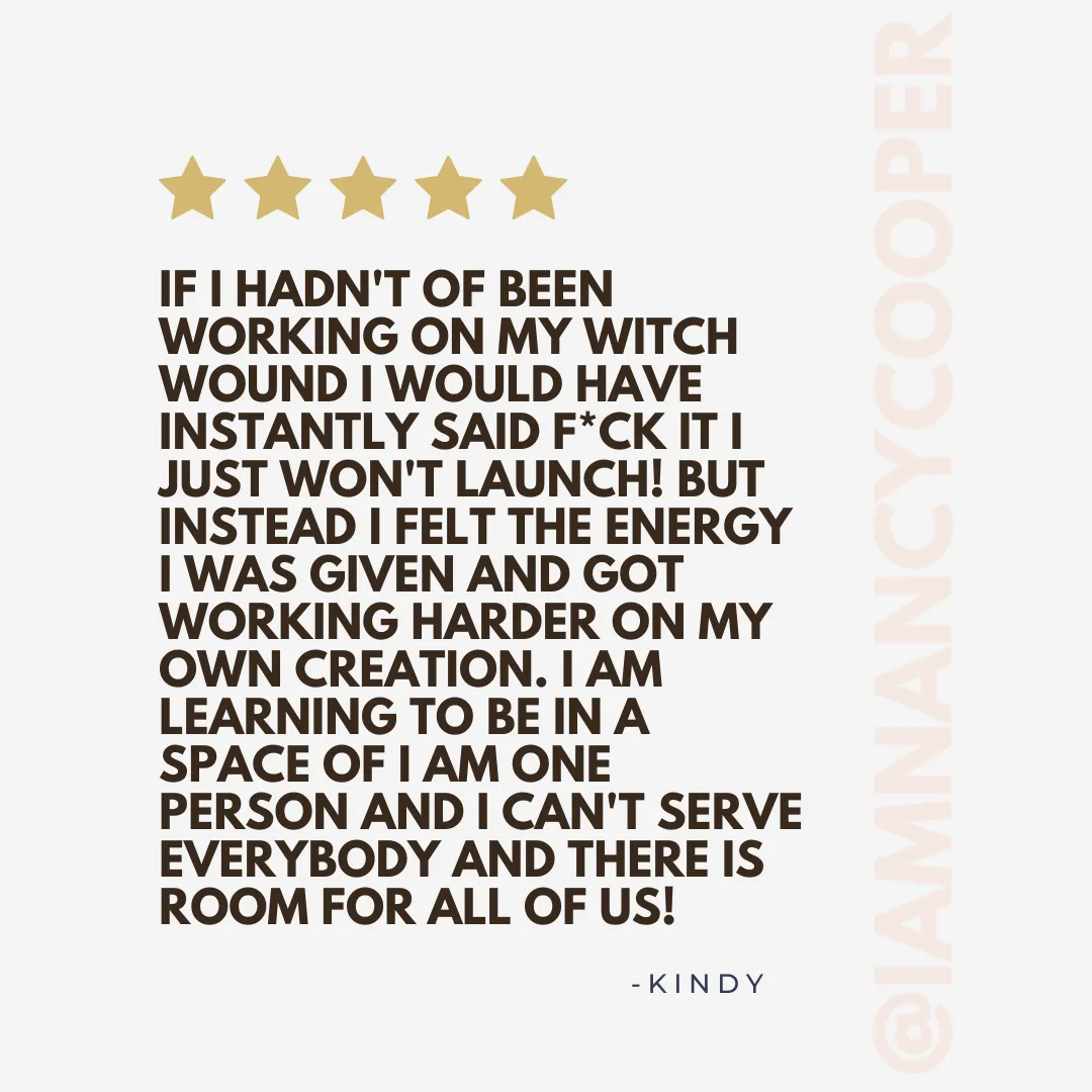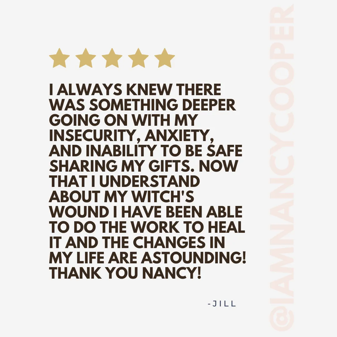 The Witch's Wound® Archetypes were identified and developed by Nancy Cooper. These archetypes are proprietary and trademarked and under no circumstances are they to be taught by or used for profit by another without written permission from Nancy Cooper. Witch's Wound® Archetypes may be referenced in public forums so long as credit is honored and Nancy Cooper is referenced or tagged. The information taught inside this program CANNOT be found anywhere else, nor is taught by anyone else.